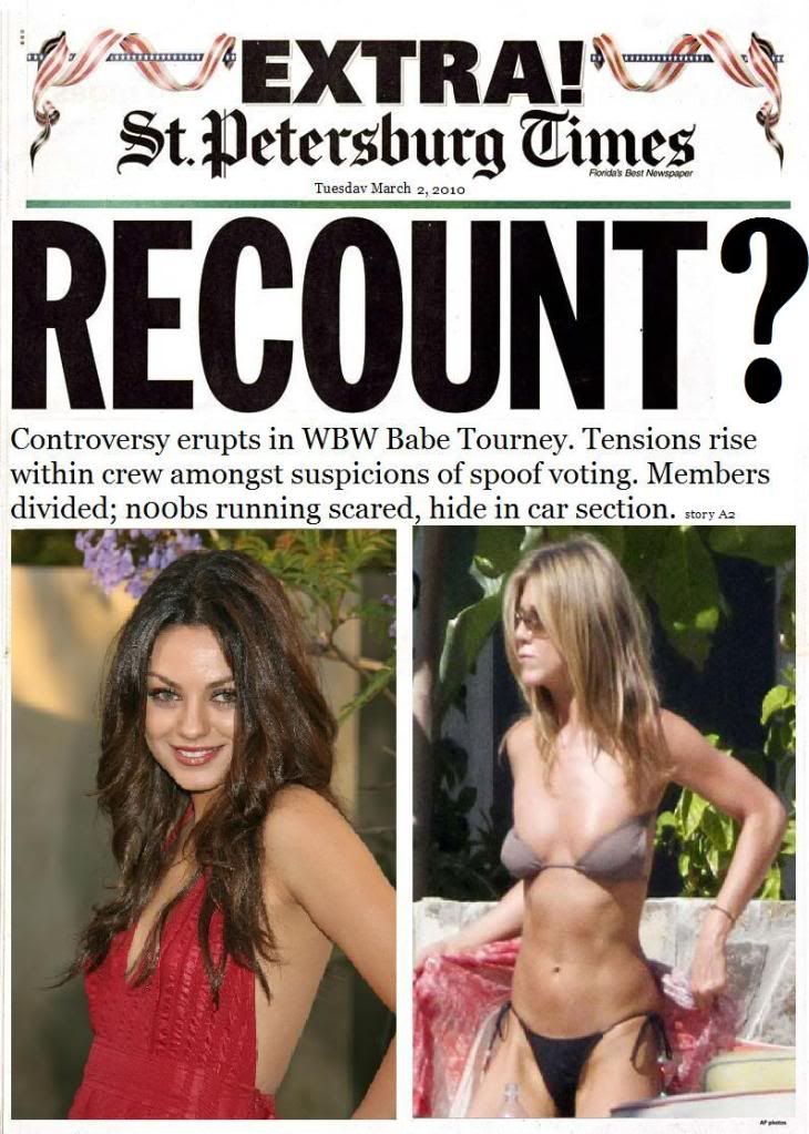 Aniston has gotten 62% of the votes since the poll closed. The biggest lead I saw during the poll had Mila ahead by 8 votes, now it's 7 the other way.... still believe the spoofs weren't propping up Mila?